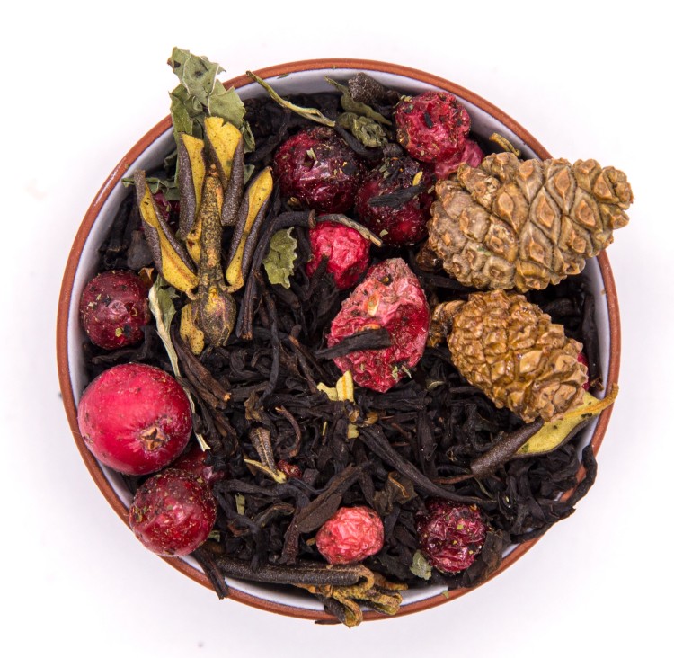 Чай черный индийский, иван-чай, шишки сосны, смородина красная ягода, клюква ягода, можжевельник плоды, мята, аромат хвойного леса