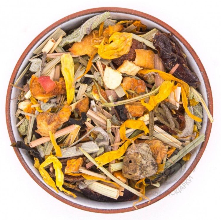 Лемонграсс, яблоко, шиповник, апельсин цедра, розмарин, иван-чай лист, шалфей, саган-дайля, календула